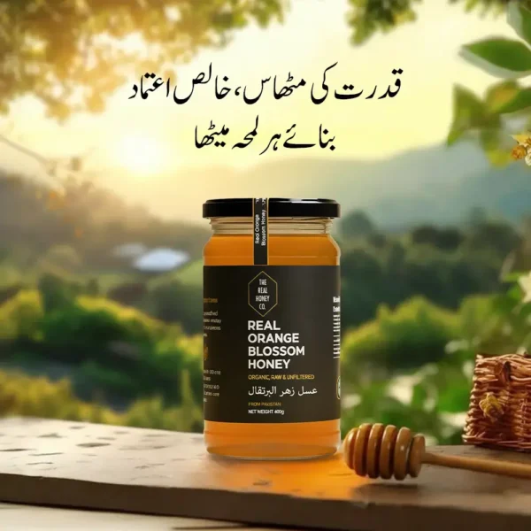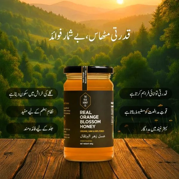 Real Orange Blossom Honey is produced when bees collect nectar from orange tree blossoms. This honey is known for its light golden color, mild sweetness, and pleasant floral-citrus aroma.