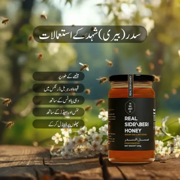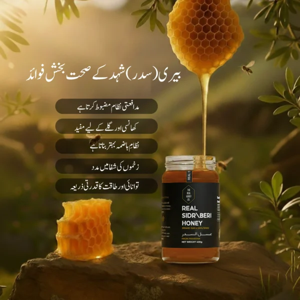 Real Sidr Honey is collected from bees that feed on the nectar of Sidr (Beri) trees, which are highly valued in Pakistan and the Middle East. This honey is known for its thick texture, deep amber color, and strong natural taste.